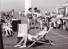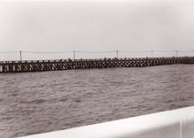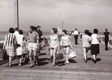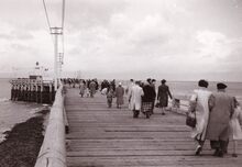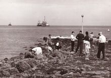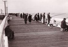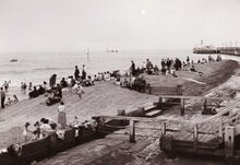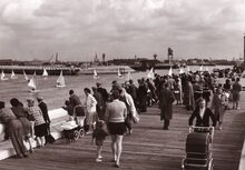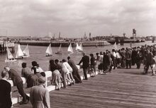 Talrijke kijkers op het "kopje van 't hoofd" ( = uiteinde van het staketsel) voor een zeilwedstrijd.