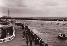 Enkele toeristen op het einde van de golfbreker naast het Westerstaketsel ofte "de Bas".Enkele schepen waaronder de mijnenveger M918 Sint-Niklaas zijn juist uitgevaren.