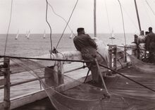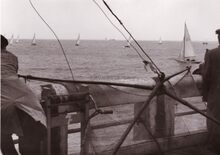 Zeilwedstrijd gezien van op het Westerstaketsel.Op de voorgrond een kruisnet.