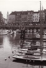 Jachten in het Montgomerydok aan de Visserskaai.Links de Nieuwstraat met achteraan de toren van het Feestpaleis.