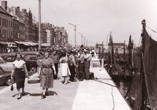 Formaat : 13 x 18 cm. - Algemeen zicht op het Montgomerydok en de Visserskaai met links het Vissersplein en rechts de Garnaalmijn. Op de voorgrond een metalen meerpaal, of bollaard