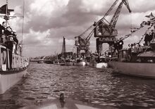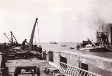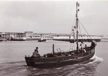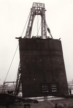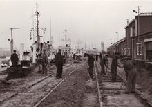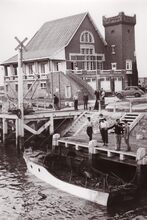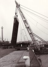 Formaat : 18 x 13 cm. - Een drijvende bok wordt geplaatst (of verwijdert) een sluisdeur aan het sas naar het Visserijdok.