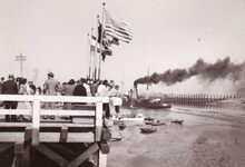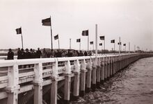 Formaat : 13 x 18 cm. - Het Weststaketsel op een feestdag (inhuldiging ?). De notabelen wandelen naar het einde van het staketsel. Tweede van rechts op de eerste rij, burgemeester Hendrik Serruys, met bril en hoed.