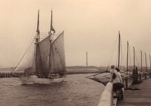 Formaat : 13 x 18 cm. - Een zeilschip vaart de haven uit.