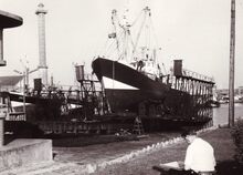 Formaat : 13 x 18 cm. - Een groot vissersvaartuig van de rederij M.V. en twee kleinere op de Slipway aan de Buskruitstraat. Zicht van op de Slipwaykaai. De twee slipways zijn geïnstalleerd op een bedding van 132,70 m. en een helling van 0,081 m. per meter. De grootste heeft een draagvermogen van 1000 ton, een lengte van 50 m. en een nuttige breedte van 11,50 m. De andere heeft een draagvermogen van 500 ton, een lengte van 40 m. en een nuttige breedte van 9,50 m. (Het havencomplex van Oostende, p.69-70) Plate bib B961.