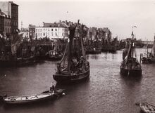 Formaat : 13 x 18 cm. - Vissersvaartuigen op de slipway aan de Buskruitstraat. Links de vuurtoren
