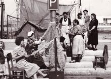 formaat : 13 x 18 cm. - Vissersvrouwen breien nette (korren) langs de Visserskaai. Op de achtergrond het Montgomerydok.
