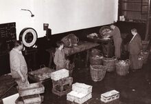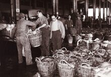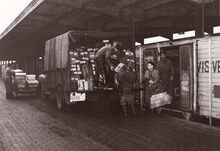 Formaat : 13 x 18 cm. - Inladen van vis op een wagon van de vistrein voor transport naar het binnenland.