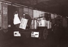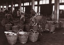 Formaat : 13 x 18 cm. - In de Vismijn worden kistjes vis ingeladen in een wagon van de vistrein voor transport naar het binnenland.