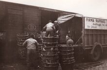 Formaat : 13x 18 cm. - Inladen van kisten vis op een trein voor vervoer naar het binnenland.