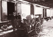 Formaat : 13 x 18 cm. - Een lading vis wordt op de trein gezet voor verzending naar binnen- en buitenland.