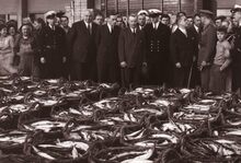 Formaat : 13 x 18 cm. - Links vishandelaar Staes met echtgenote en anderen tonen fier een grote heilbot.