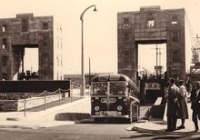Formaat : 13 x 18 cm . - De O.205 Montreal, aangemeerd aan de Oostkaai van het Vlotdok, rechts de Demeybrug. In december 1949 vertrok het vaartuig naar Argentinië om daar de visserij te bedrijven