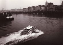 Formaat : 13 x 18 cm. - Een gezonken jacht in het Montgomerydok. De kaaimuur links vertoont nog de sporen van de vernielingen uit de Tweede Wereldoorlog.