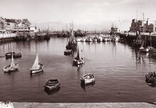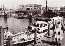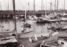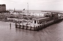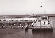 Formaat : 13 x 18 cm. - We zien de haveningang met de twee staketsels en de insteek naar het Montgomerydok (links). Vooraan het gebouw van de jachtclub NSYC en er achter (links) het klein strand.