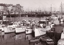 Formaat : 13 x 18 cm. - Mensen genietend van de zon aan de zijgevel van de garnaalmijn aan de Visserskaai.