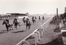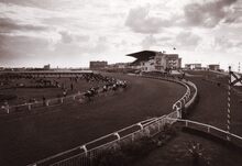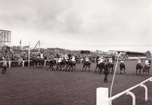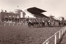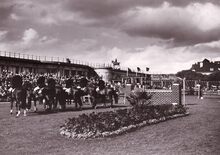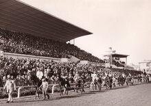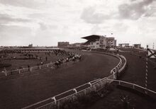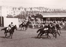 Algemeen zicht op de renbaan.De paarden gaan de bocht in aan de tribune.Foto van op de Sportstraat richting Mariakerke,op de achtergrond de 17 Oktoberstraat met de "Buckingham".Rechts de Koningin Astridlaan.