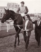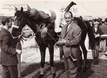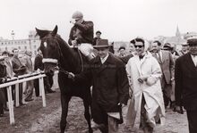 Jockey VANHAN wordt gehuldigd op de renbaan.