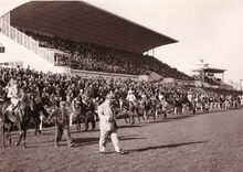Doortocht van de renpaarden aan de grote tribune op de renbaan onder grote belangstelling.