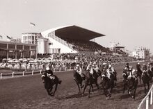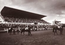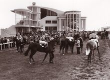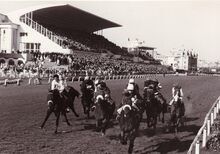 Doortocht van de deelnemers aan een koers aan de afgeladen tribune op een topdag op de Wellington.Rechts de Koninklijke Loge.