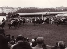 Doortocht van de deelnemers aan een koers aan de tribune van de renbaan.