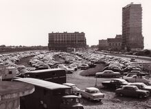 De parking van de renbaan aan de Troonstraat,rechts is de eerste sectie van Residentie Royal Palace in opbouw.Op de achtergrond de 17 Oktobersstraat met links het oude Buckingham Hotel en rechts de SacrΓ© Coeur.