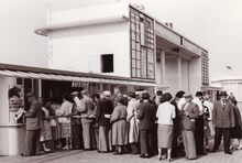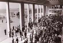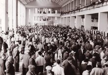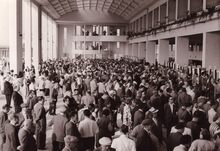 De bookmakerszaal onder de grote tribune van de renbaan aan de zeedijk.Rechts de Koninklijke Gaanderijen.