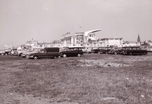 De buitenparking van de renbaan aan de Troonstraat.Acheraan de "Bagatelle" en de grote tribune.