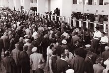 Het gokkend publiek bij de bookmakers op de renbaan.