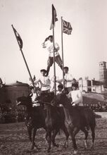 Formaat : 18 x 13 cm. - Zes Russische ruiters geven een demonstratie van hun kunnen op het plantsoen van de Koninklijke Gaanderijen.