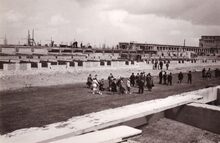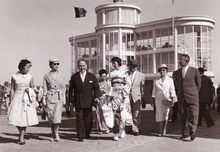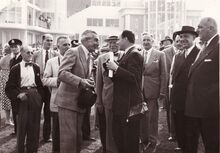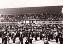 Formaat : 13 x 18 cm. - Bezoek door genodigden aan de werf tijdens de heropbouw van de renbaan na de Tweede Wereldoorlog. Hier komt de grote tribune.
