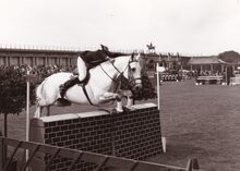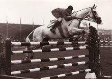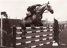 Formaat : 13 x18 cm. - Ruiter en paard nemen deel aan de jumpingwedstrijd
