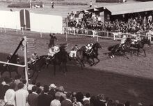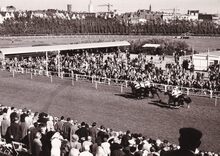 Aankomst van een race op de renbaan.Op achtergrond links de gevels van de Sportstraat en de Eduard De Cuyperstraat.