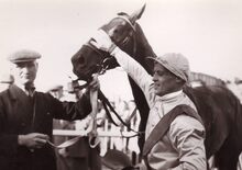 Formaat : 13 x 18 cm. - Jockey W. Speer met Artemis nazijn overwinning in de paddock