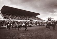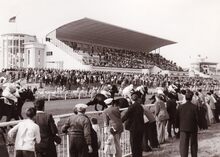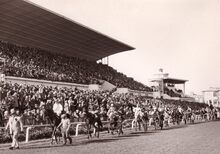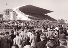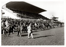 Formaat : 13 x 18 cm. - Het publiek onder de tribune van de Wellingtonrenbaan bij de bookmakers.