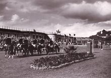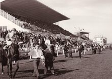 Formaat : 13 x 18 cm. - Paarden en jockeys in de paddock