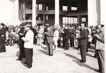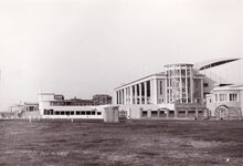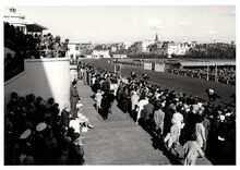 Formaat: 13 x 18 cm. - Optocht van de deelnemers aan een koers passerend voor de afgeladen tribune
