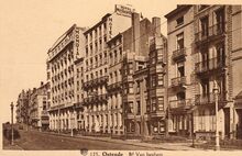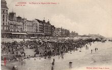 Het Groot Strand gezien te westen van het Kursaal, richting het Koninklijk Chalet en op het einde het Royal Palace Hotel. Links, de grote hotels langsΒ de Zeedijk.