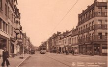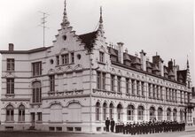 Detail van het Postgebouw gezien vanuit de Karel Janssenslaan. Rechtdoor, de Wittenonnenstraat. Het gebouw was gelegen in de Hendrik Serruyslaan en werd gebouwd in 1906 naar de plannen van architect Charles De Wulf