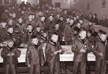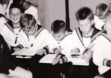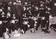 Formaat : 13 x 18 cm. - De leerlingen van de Ibisschool komen toe aan het Kerkhof Stuiverstraat voor de jaarlijkse hulde aan de op zeegebleven vissers,