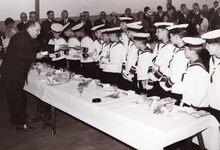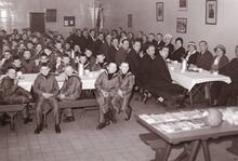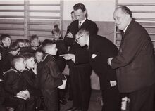 formaat : 13 x 18 cm. - Ontvangst van prins Alexander op de school. Naast de prins zit bisschop EmielΒ Jozef DesmedtΒ daarnaast burgemeester Adolf Van Glabbeke. Rechts naast de micro burgemeester August Plovie van Bredene.