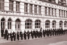 Formaat : 13 x 18 cm. - Leerlingen opgesteld voor het schoolgebouw