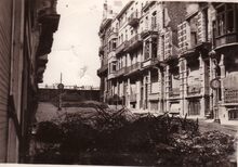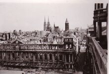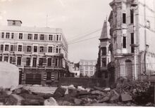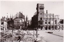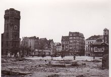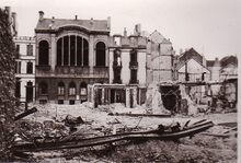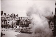 Foto : 9 x 6 cm. - De resten van het vernielde stadhuis.