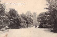 Het Leopoldpark met op de achtergrond het postgebouw in de Hendrik Serruyslaan.