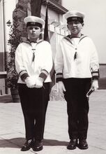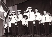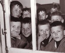 Formaat : 13 x 18 cm. - Leerlingen van de Ibisschool op het kerkhof aan de Stuiverstraat bij een bloemenhulde aan het monument voor de op zee verdwenen vissers.