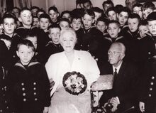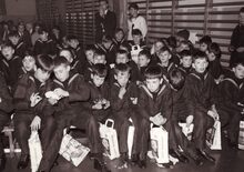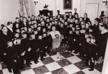 "Het bezoek ging door op dinsdag 22 december 1964. Vijfentachtig jongens, piekfijn uitgedost in hun zondagsuniform, werden samen met directeur en mevrouw Caestecker, schoolhoofd lager onderwijs Robert Coelus, juffrouwen Hamers en Casier en de opvoeders Verheire en Verhamme verwacht om 16 uur. De groep werd opgewacht door koningin Elisabeth in de hal van het kasteel. De leerlingen Valère Vansteene, Robert Sel en Eddy Debaenst overhandigden haar een ruiker rode baccararozen. Franky Van Troye las een dankbrief voor. Vervolgens werden onder leiding van Robert Coelus een paar kerstliederen gezongen. Er was een vieruurtje voorzien met cacao en boterkoeken. De koningin hield zich geruime tijd met tal van leerlingen bezig. Elke jongen kreeg een klein geschenk. Voorzitter Solvay en commandant Goor waren op dit intiem koninklijk kerstfeest aanwezig. Voor iedereen een onvergetelijke gebeurtenis"