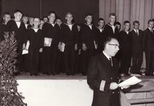 Formaat : 13 x 18 cm. - De plechtige communicanten van de Ibisschool. Links, directeur Hubert Caestecker.