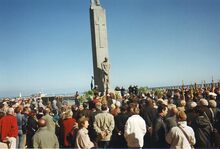 2 foto's, formaat : 15 x 10 cm. - Jaarlijkse vissershulde aan het Monument der Zeelieden op het Zeeheldenplein.