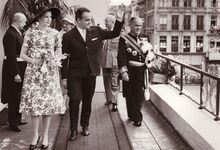 Aankomst van de prins en prinses van Monaco op het Wapenplein bij de jumelage Oostende-Monaco.Rechts vooraan stapt burgemeester Adolf VAN GLABBEKE.