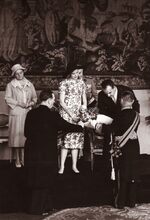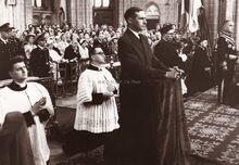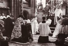 Kerkelijke plechtigheid in de Sint-Petrus- en -Pauluskerk tijdens de jumelage Oostende-Monaco. Vooraan links Pierre VAN OUTRYVE D'YDEWALLE, gouverneur van West-Vlaanderen, rechts burgemeester Adolf VAN GLABBEKE, uiterst links politiecommissaris DEGRUYTTER. De knielende priesters, links ROORYCK (de latere directeur van het OLV College Gistel), rechts Paul VANZEIR (de latere directeur OLV College Oostende) en in het midden de kerkbaljuw Afred DESMIDT.